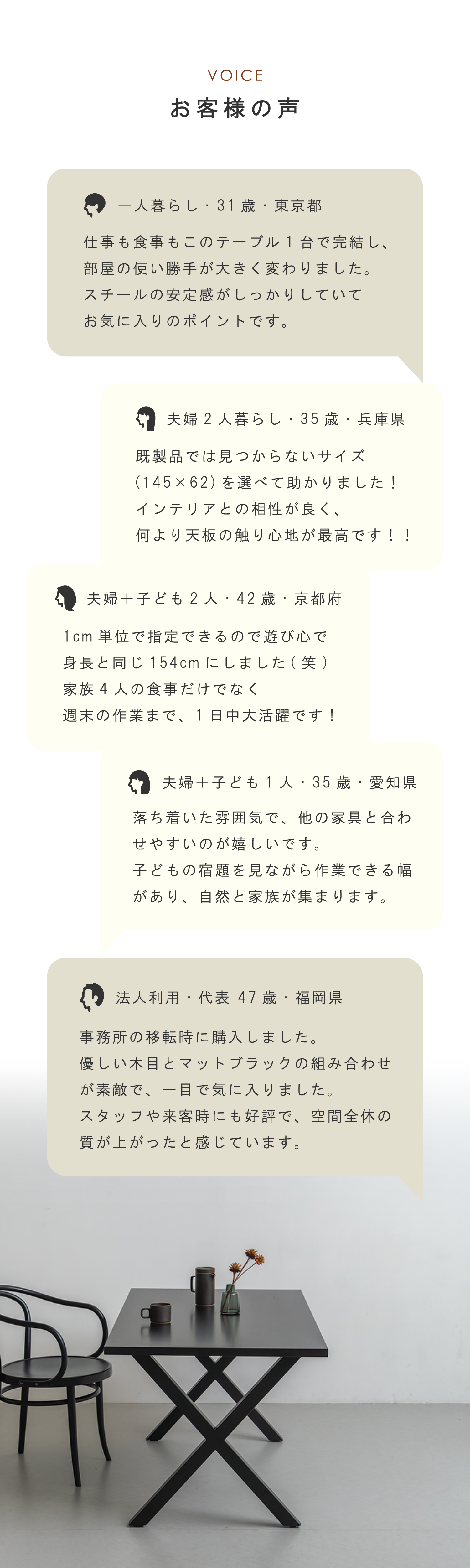 4種類の無料オーダーが可能 サイズ / 天板カラー / 脚デザイン / 面取り加工